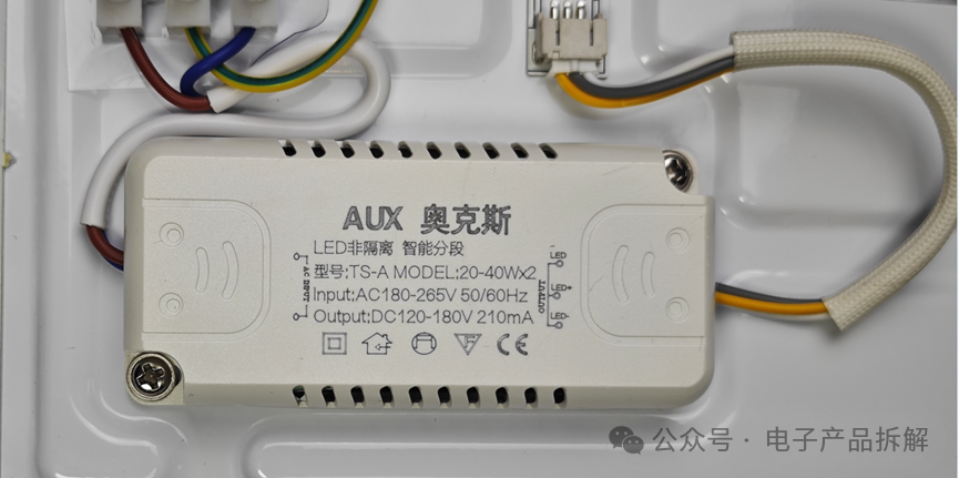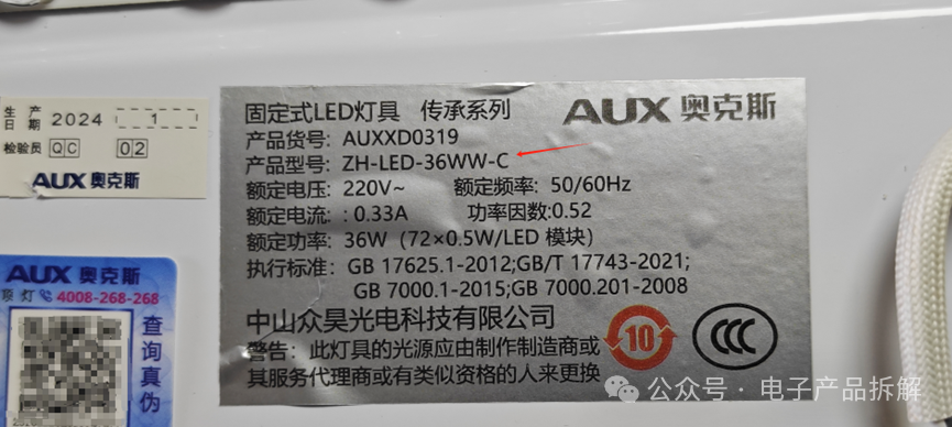 合格证上的生产日期是24年1月,嗯,还挺新。铭牌上有产品型号,货号等,可以看出是36W的额定功率,折算下来功率单价为1.9元/W,比之前拆的那个22W179元的功率单价8.1元/W划算多了。通过了3C认证,产品设计的使用周期是10年。执行的标准有: