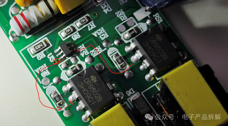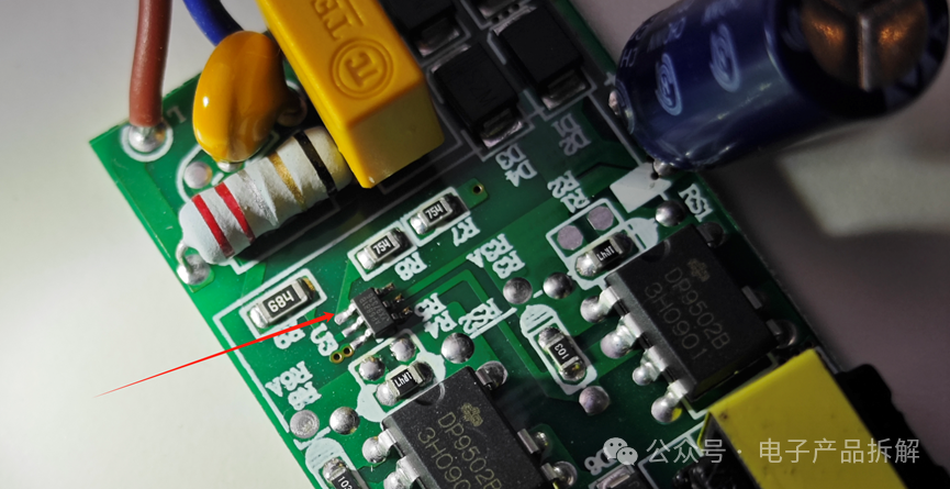 抬起这个输入电容之后,可以看到下面有一个SOT23-6的芯片,这个芯片的丝印是AP6881B,这个芯片是谁家的?它的作用肯定就是用来做两路LED色温记忆与调节的了。本文原创发布于公众号电子产品拆解。用户通过连续按压墙壁上的开关,可以实现三种色温的切换。它有两个输出引脚,分别接到LED恒流驱动芯片DP9502B,从而控制这路LED的开关。