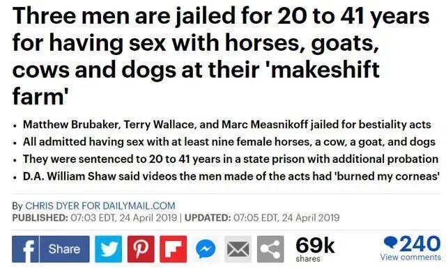 其中一人每周多次性侵母马,而另一人则每天至少与农场动物发生性行为。他们甚至将这些恶行拍摄下来,用作“记录”。