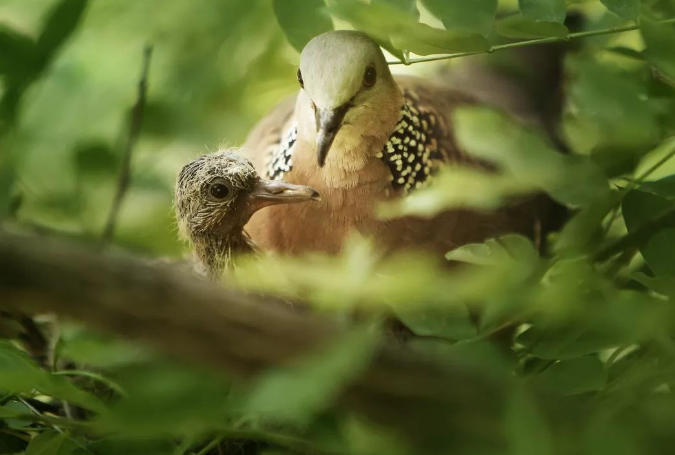 有时,你可能会看见树上一个摇摇欲坠的鸟窝,里面还放着一两枚鸟蛋,这八成就是斑鸠的杰作。