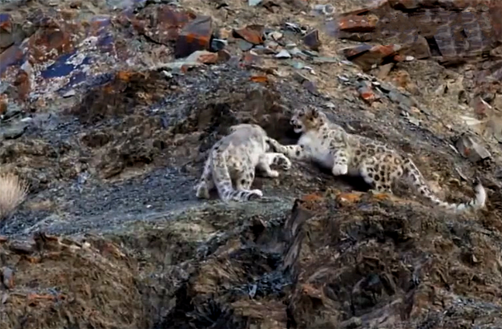 当幼崽长到两个多月大时,它们可以跟着母雪豹一起出洞活动了。它们会嬉戏打闹,练习捕猎技巧,学习生存技能。