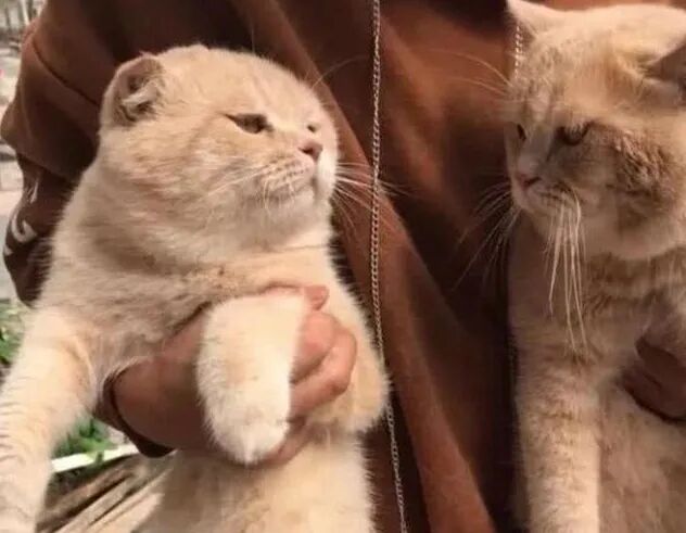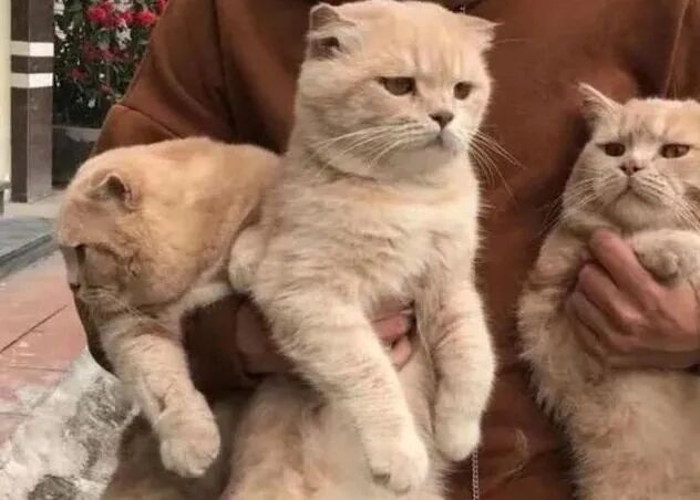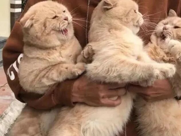 这天主人带着自家的猫咪在门口玩耍,为了向朋友炫耀自己的猫咪,于是主人徒手把3只橘猫抱了起来,这主人的臂力可真是惊人,橘猫可是很胖的呢~!