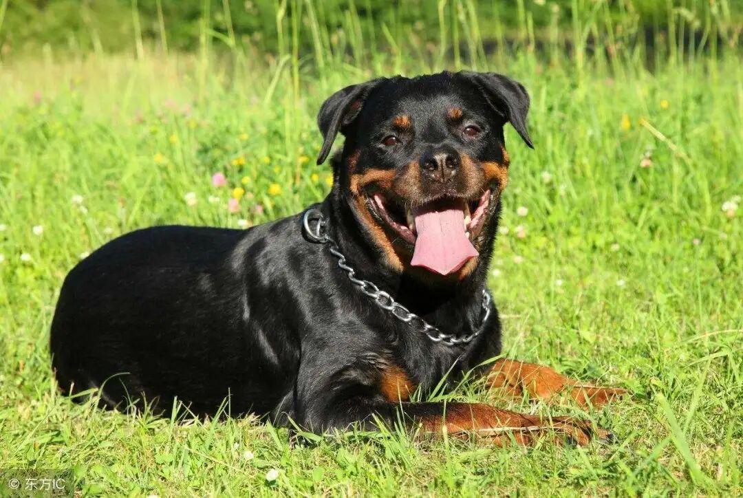 罗威纳犬是一种强壮、迅猛的狗狗,原本用于看守牛群。它们具有很高的智商和警觉性,但同时也有着较强的攻击性。