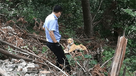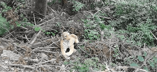 李警官用树枝轻轻一碰,这只“猛兽”竟然轻轻翻了个身,露出了它的真实身份——一只造型逼真的老虎玩偶!