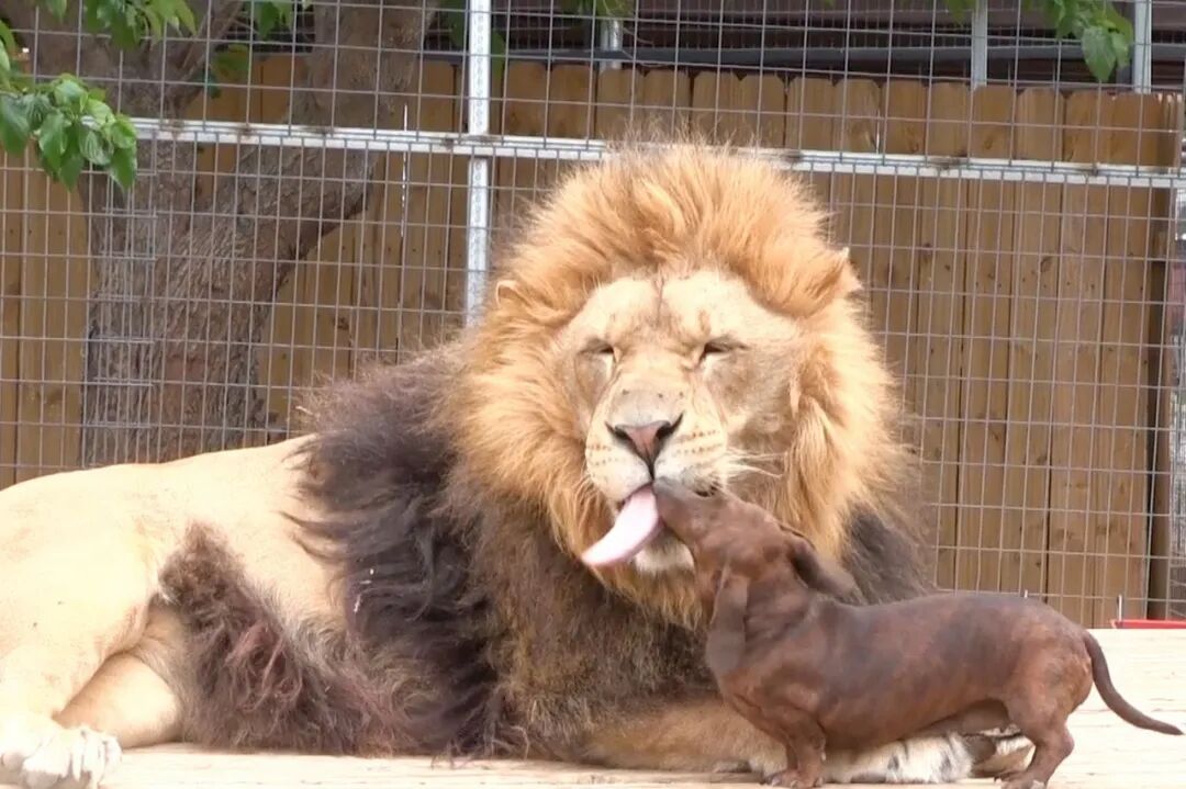 动物园里的一头雄狮子老了,管理人员送来两只小狗陪伴,意外的画风来了!
