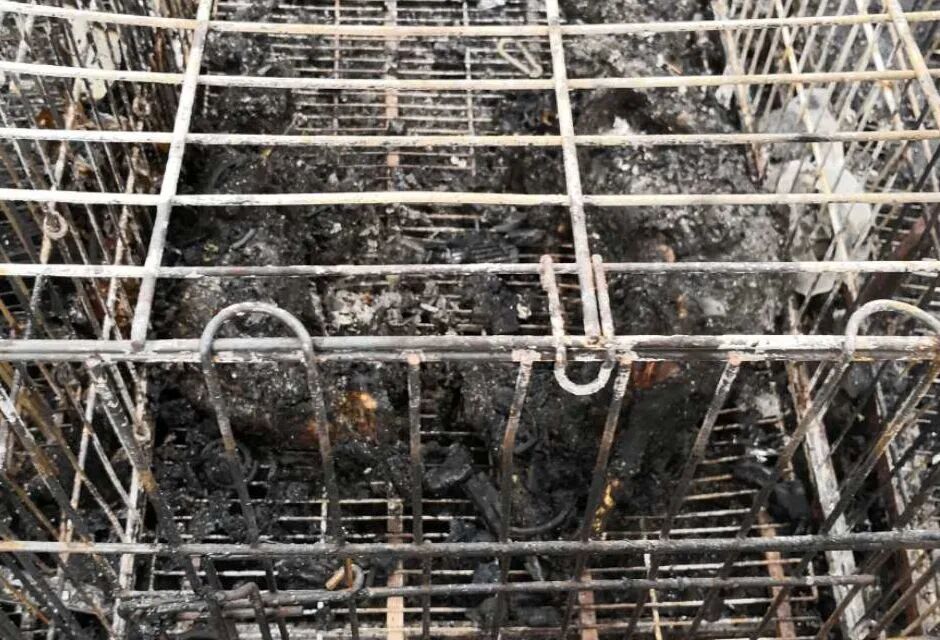 它们被烧成焦黑状,躺在笼舍的栅栏处。