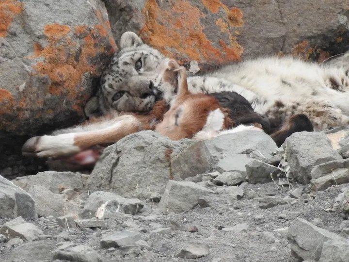 就在这个时候,阿力木突然想到了一个办法。他迅速跑回家中,取来了一桶油漆。然后,他朝着雪豹泼了过去。