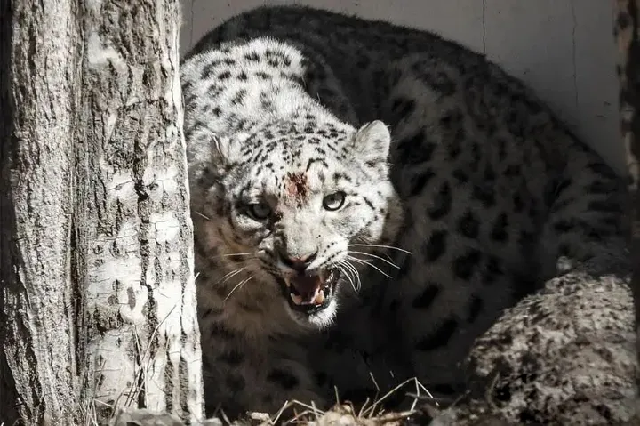 雪豹被油漆泼了个正着,它的眼睛被油漆糊住,无法看清周围的情况。它开始慌乱地四处乱撞,试图摆脱这个突如其来的攻击。