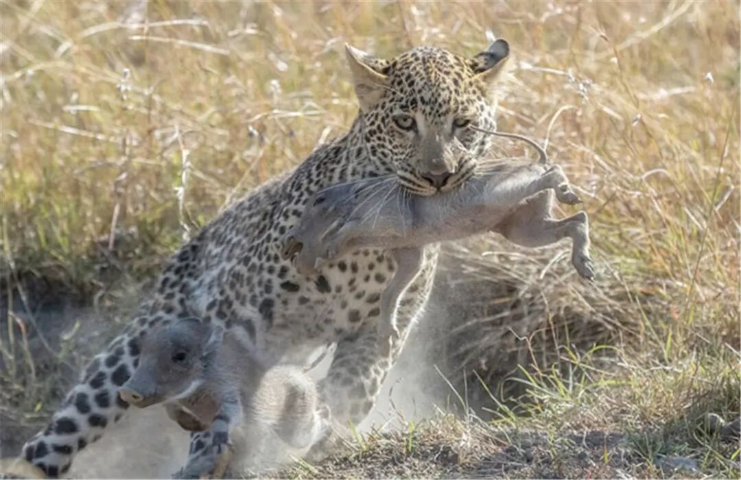 然而,母疣猪的獠牙如同两把锋利的匕首,它不断地扭动身体,试图用獠牙刺向豹子的要害。