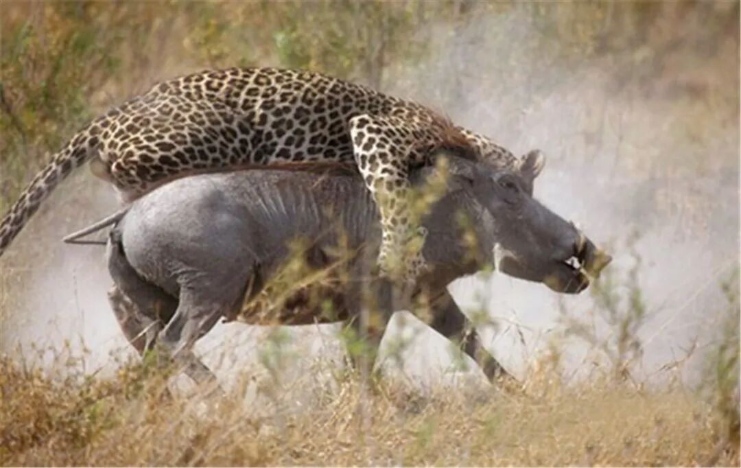 它们缠斗的身体在草地上翻滚,尘土飞扬......豹子的利爪在母疣猪的皮肤上留下了一道道血痕,而母疣猪的獠牙也在豹子的身上留下了印记。