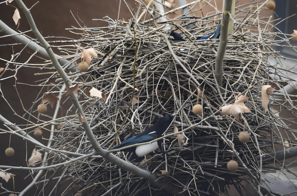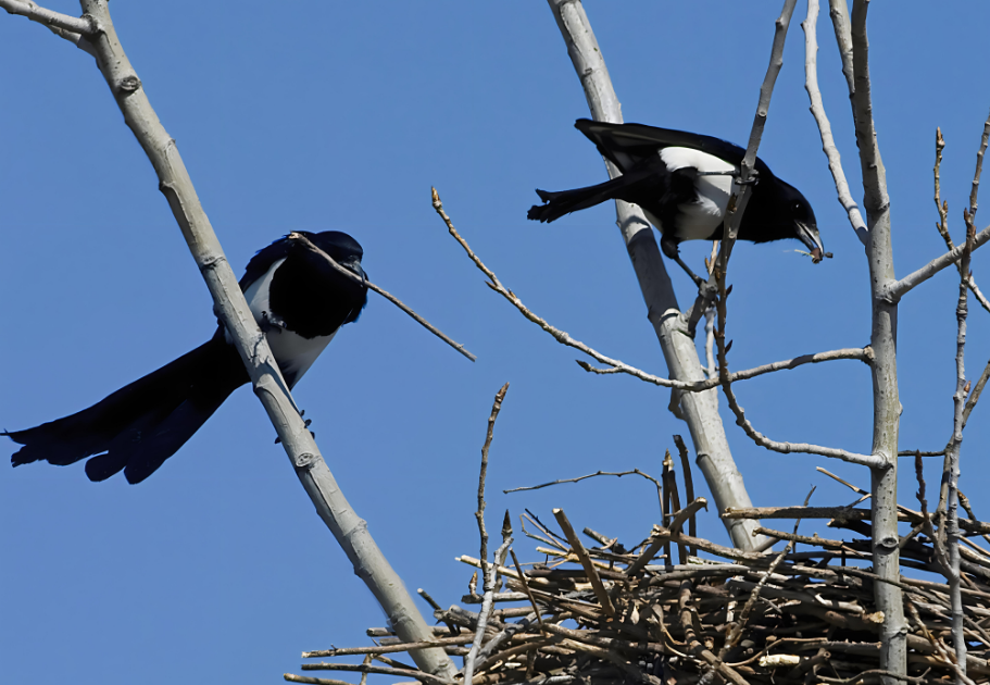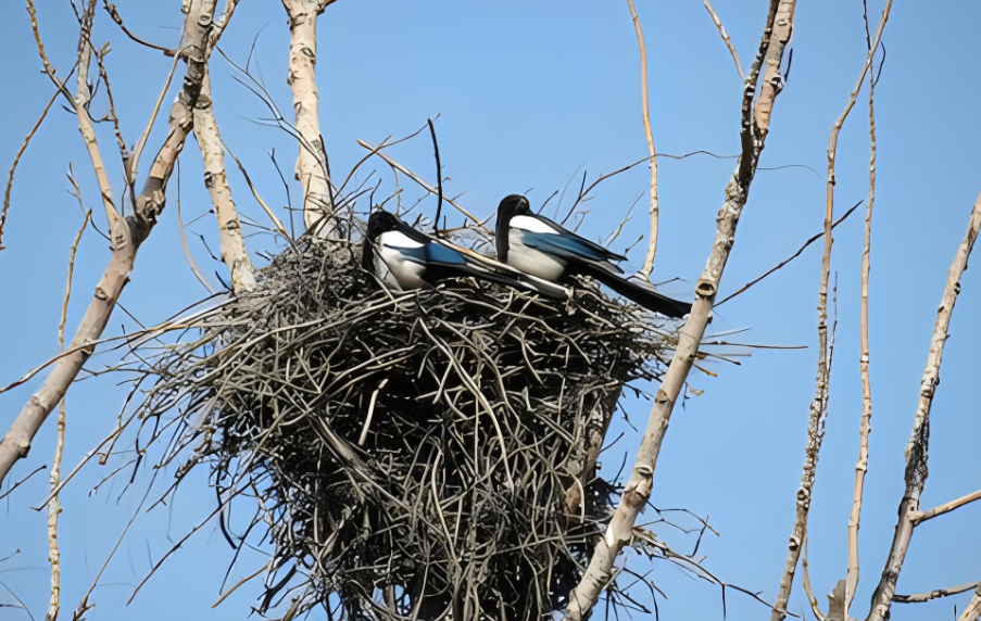 喜鹊不仅是吉祥的象征,它们还是自然界中的优秀建筑师。每年春天,喜鹊都会在当地筑巢或者翻新旧巢,为即将到来的繁殖季节做准备。