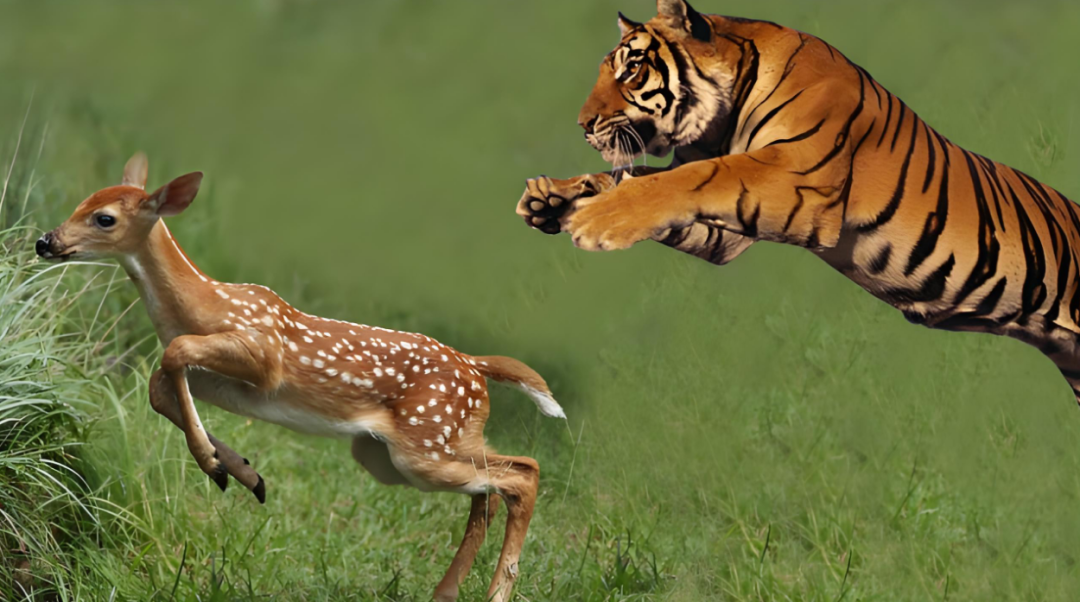 这只东北虎在山林中追逐着一群梅花鹿,受捕食欲望的驱使,却不慎触发了隐藏的陷阱。坚固的铁丝紧紧地束缚住了它的腿,使它无法挣脱,陷入了绝望的困境。