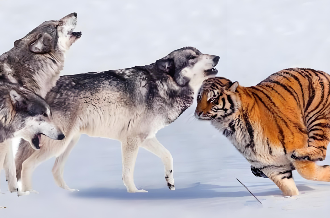 东北虎的利爪和尖牙让狼群措手不及,它们在东北虎的猛烈反击下溃不成军。