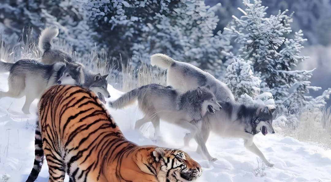 狼群停下了脚步,它们不解地看着东北虎,不明白这只应该在深山中捕猎的猛兽为何会出现在这里。
