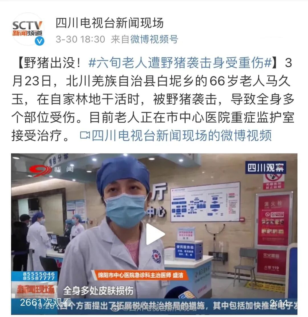 再往前一个多月,3月23日,北川羌族自治县一位66岁的老人马久玉在自家林地干活时,遭到野猪袭击,被撕咬后顶下悬崖。全身多处被撕咬留下窟窿,现场还有老人被咬下来的身体组织。后经过一个多月的治疗,才脱离生命危险,治疗费用10万多元。