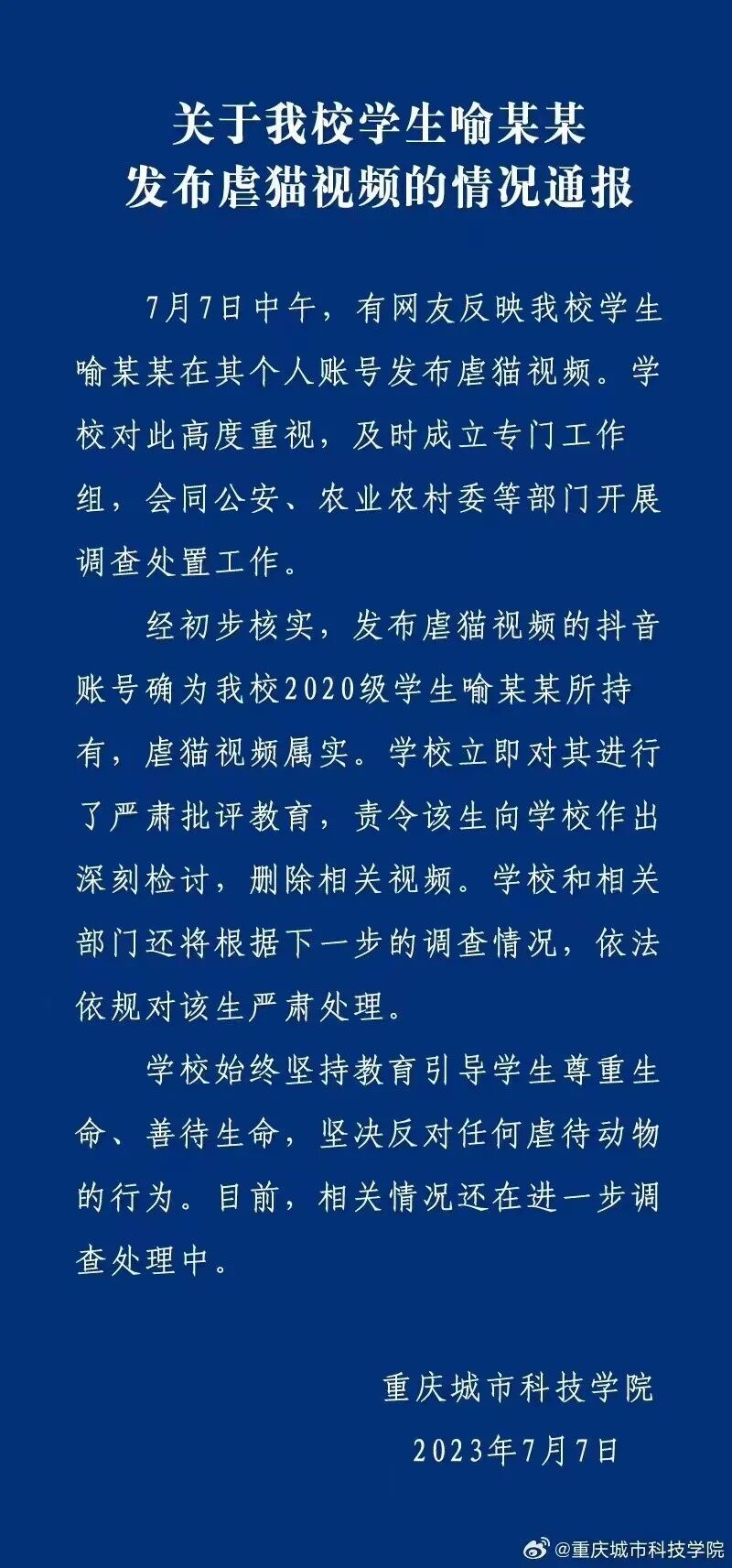 虐猫视频曝出后,位于重庆市永川区的重庆城市科技学院通过其官方微博,发布通报称,“经初步核实,发布虐猫视频的社交媒体账号确为我校2020级学生喻某某所持有,虐猫视频属实”。