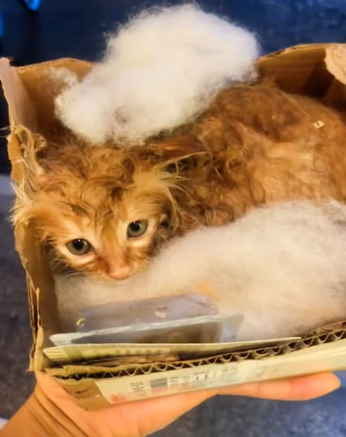 担心得不得了的老板,拍了拍小猫的肚皮,结果竟然吐出了好多水!谢天谢地,小家伙终于苏醒过来,还开始喵喵叫了。他急忙准备了一个纸箱,里面塞满棉花,给小奶猫提供温暖的家。