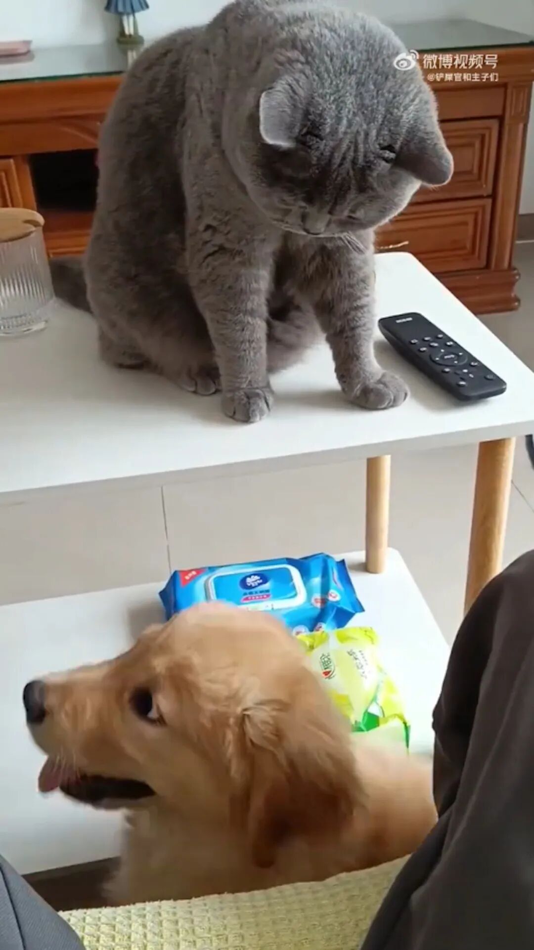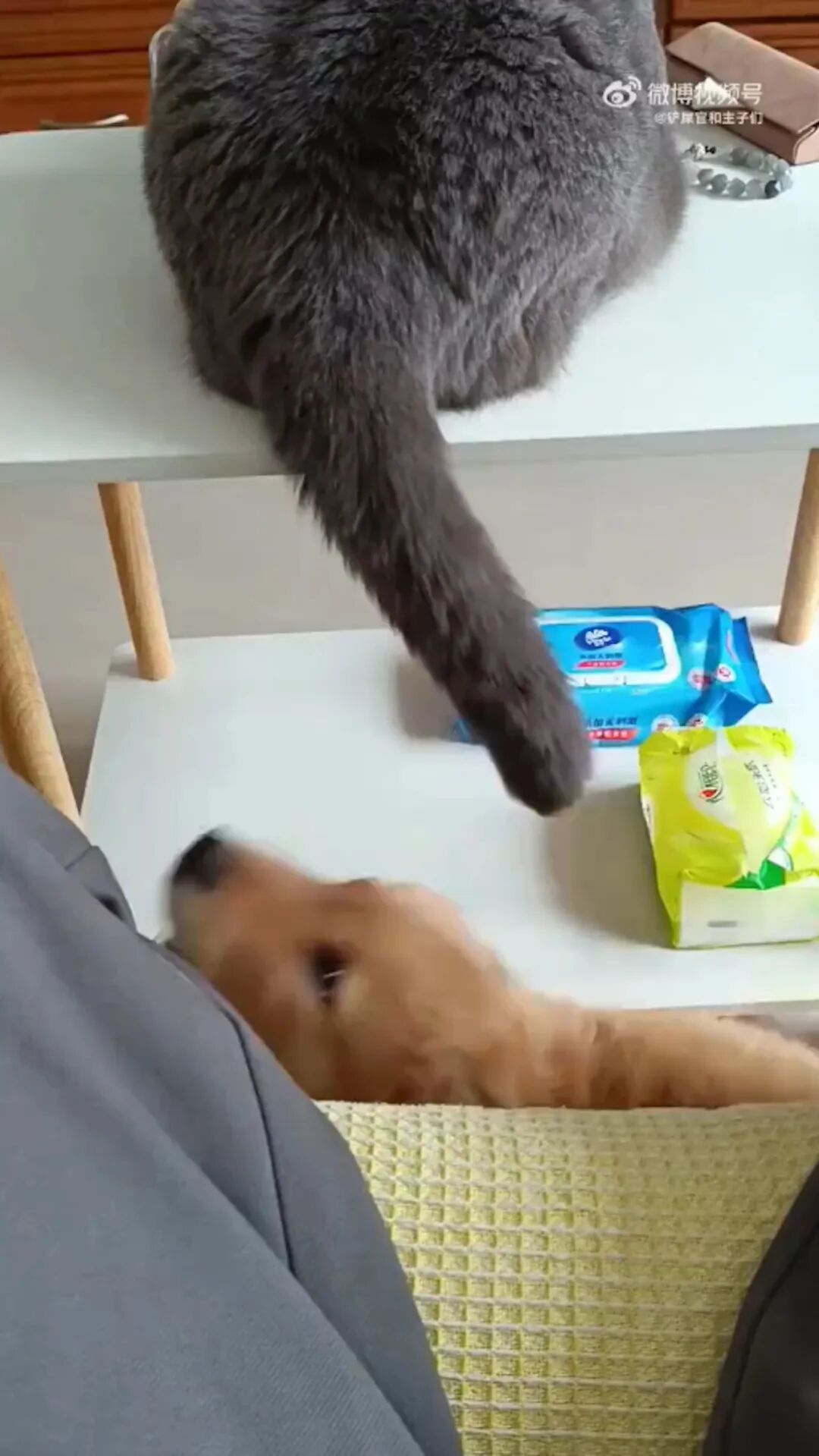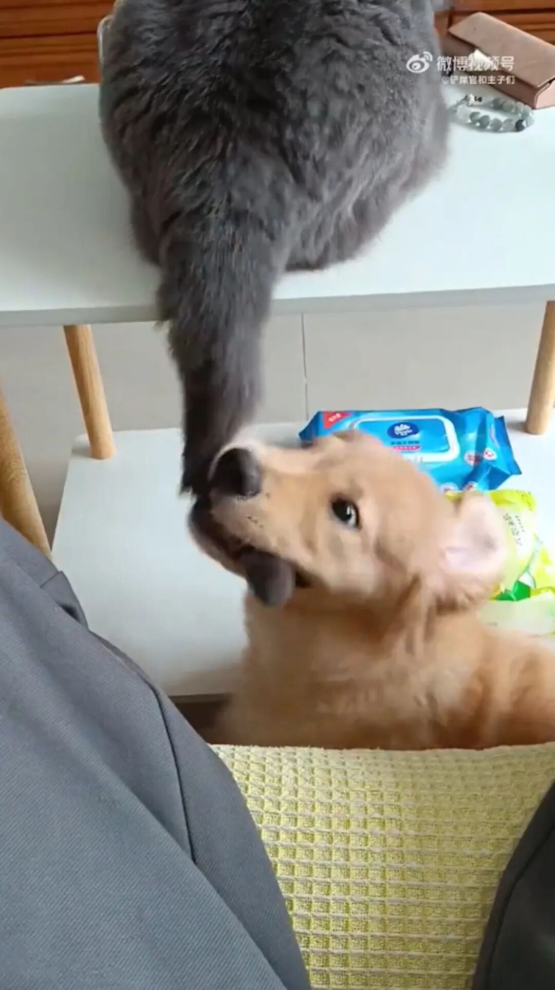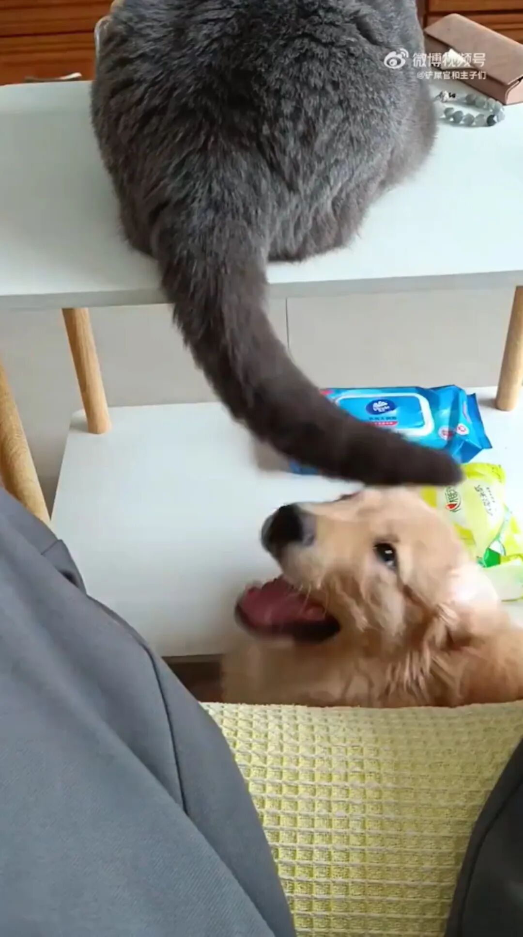 有个网友上传了一段可爱的阿金和猫咪互动的视频,猫咪坐在桌子上,尾巴自然垂落,这时金毛寻回犬竟然冲着猫的尾巴一口咬下去,结果猫皇转身瞬间甩了连环巴掌。