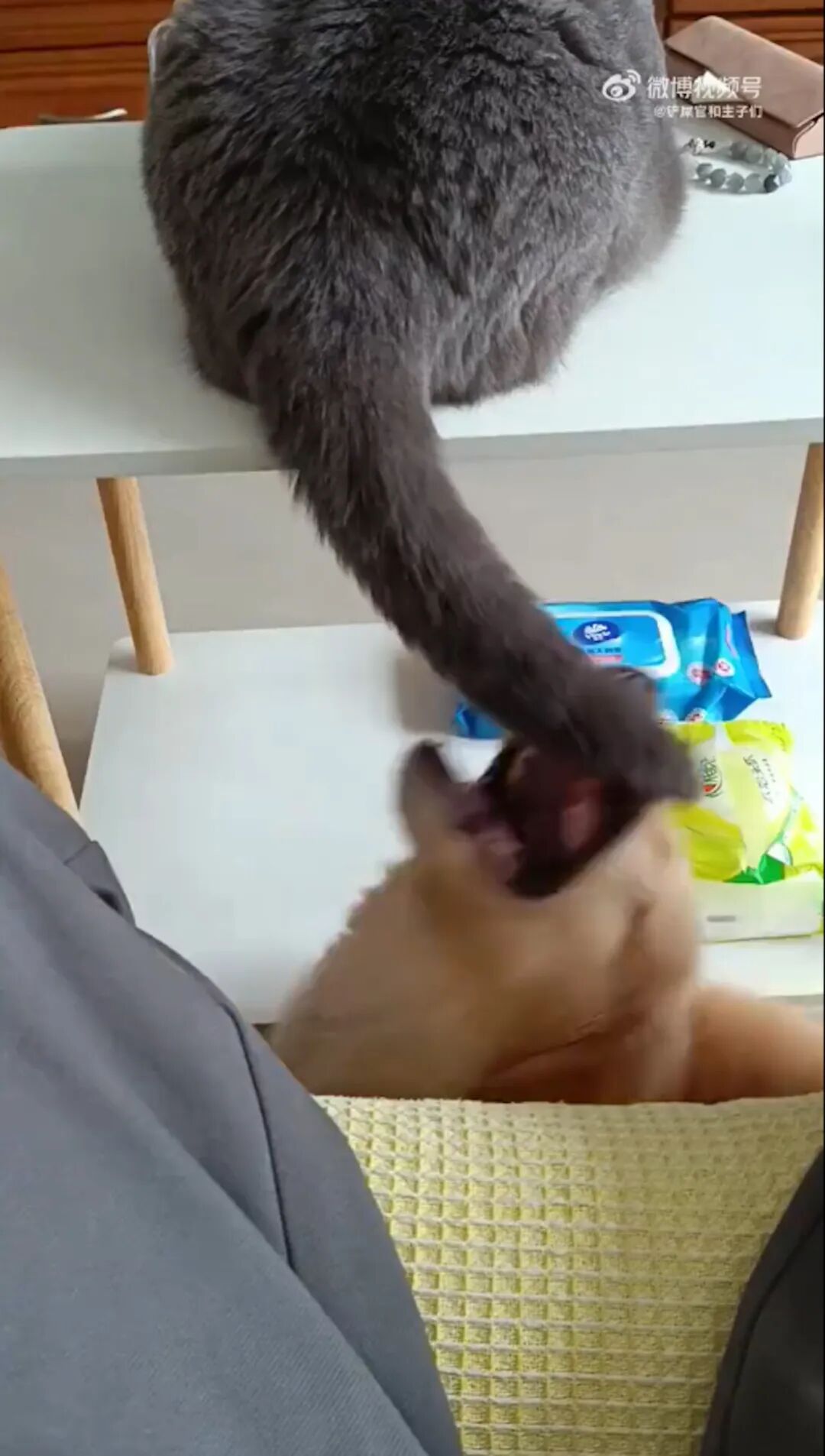微博账号“铲屎官和主子们”最近转发了这段阿金和猫咪大战的视频。当时猫咪跳上桌子,尾巴自然垂落,吸引了阿金的目光。