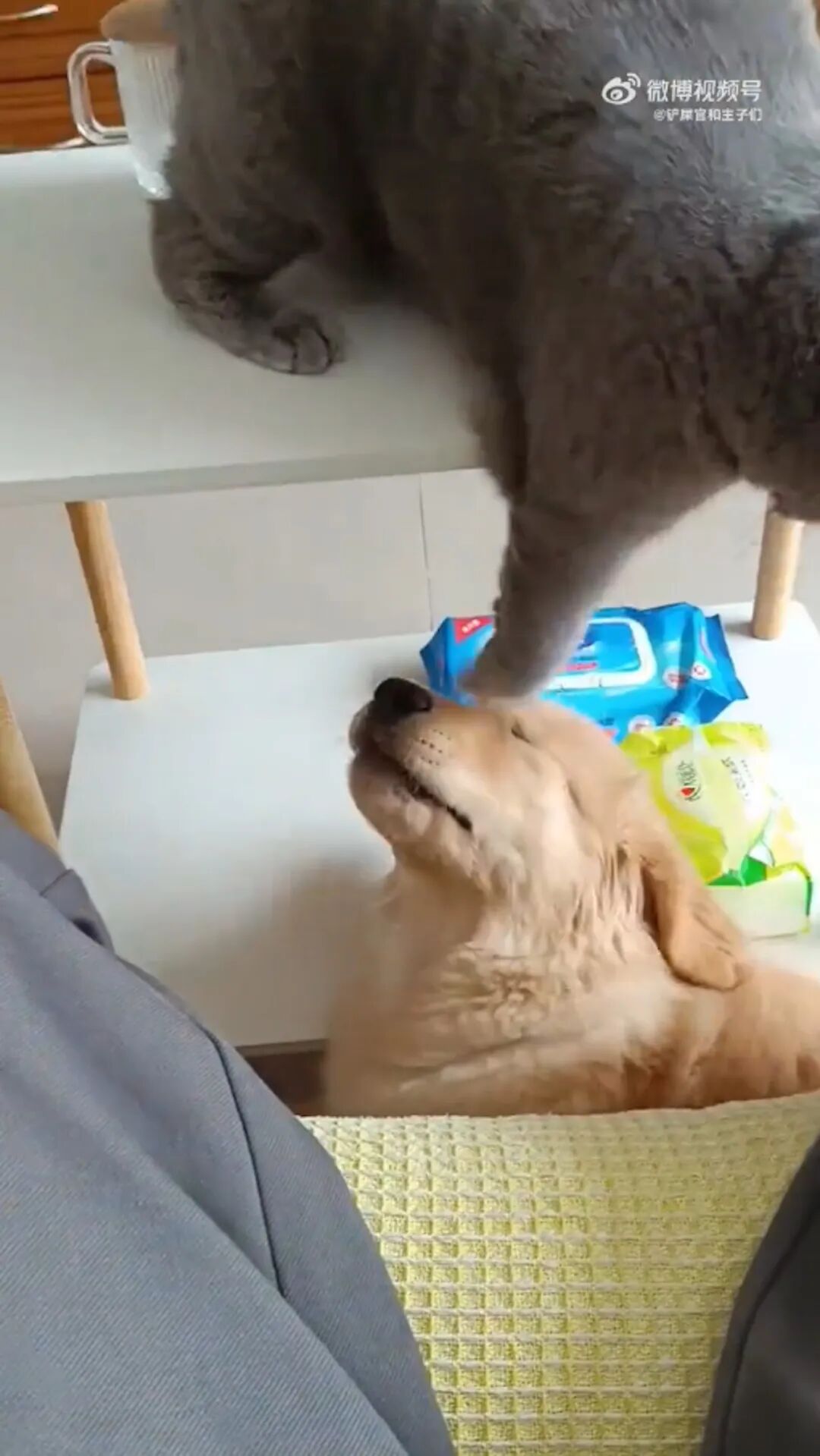 而猫咪越想越不对劲,连续给了阿金好几个巴掌,而阿金只是愣在原地不动,网友们开玩笑说:“大黄一脸享受”,“为什么要奖励它”,“这力度明明是按摩”。