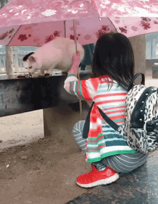 孩子总是天真善良的,看到需要帮助的小动物,很难会无动于衷,好比这位可爱的小女孩,在雨天偶遇了一只饥肠辘辘的流浪猫,她立即停了下来,请求妈妈去买一些猫粮;