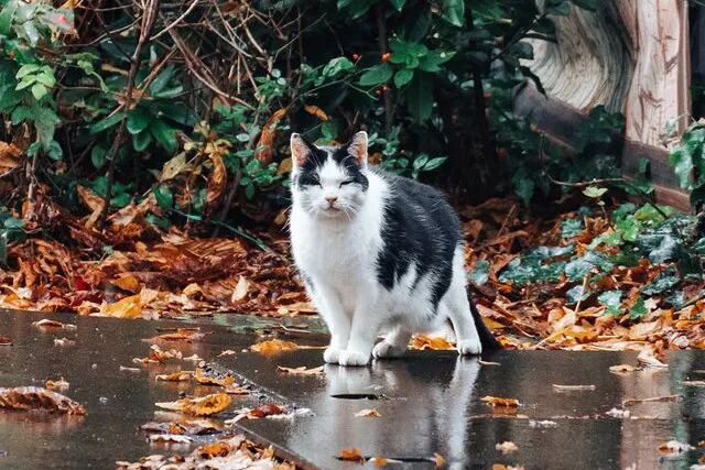 显然,这只流浪猫是幸运的,不仅没有让雨水打湿毛发,而且还遇到了好心人,最后更是吃饱喝足,等到雨停了之后,猫咪又快速消失了,可能也不想打扰大家吧!