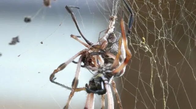 这份礼物不仅美味、还有诚意,雌性蜘蛛自然更容易接受雄性的性挑逗。雌性金圆蛛一边吃着送来的腿,一边交配[1]。
