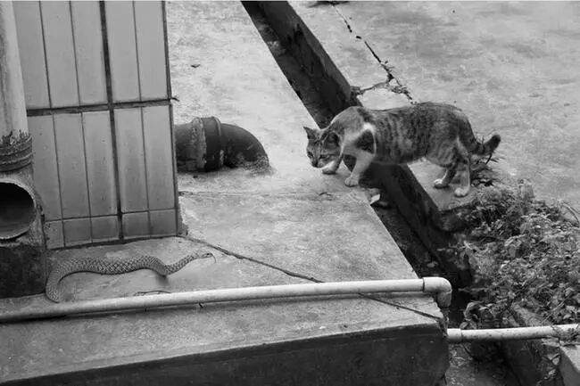 在农村野外,我们其实很少见到猫和蛇打架的情况,狗也是如此。只有当蛇闯入屋内时,猫和狗才会发出警告并试图驱赶蛇离开。