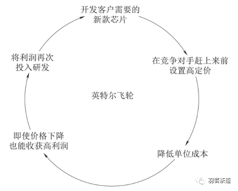 开发客户期待的新款芯片→在竞争对手赶上来前设置高的定价→随着产量增加,形成规模经济,单位成本得以降低→即使在竞争对手压低价格的情况下,英特尔也能获得高额利润→将这些利润再次投入研发和下一代芯片设计。