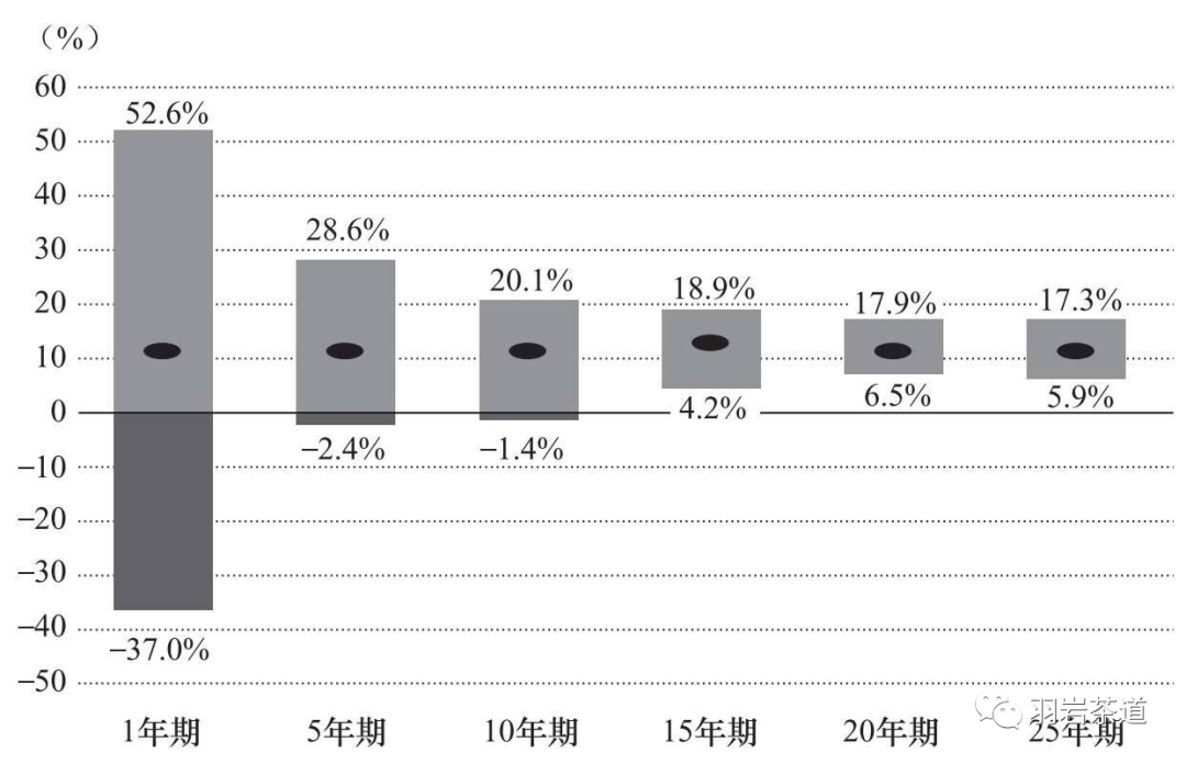 但是,如果你只投资1年的时间,收益率的波动范围就非常大,一年当中,一个正常的股票组合带来的收益率可能超过52%,而在另一年,这个组合的亏损率可能达到37%。