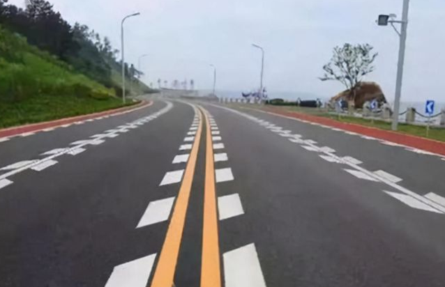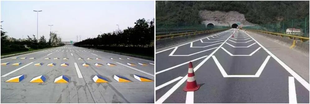 错视觉减速标线,有好几种样式,绘制了一些让人产生错觉的图案,让路面看起来变窄或者下凹,警示司机减速。一般设置在进出匝道、进出隧道、急转弯道等地方。