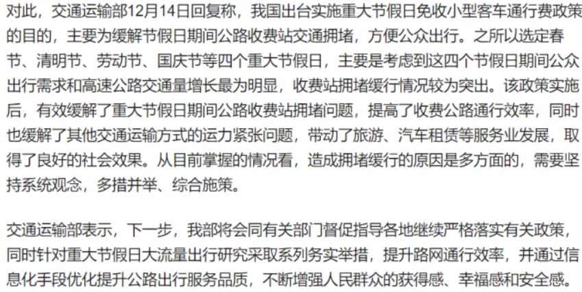 当然,这个建议也不是没有争议的。有些人就担心,取消节假日免费政策后,会影响旅游业的发展。其实,这种担心是多余的。因为改为每辆车每年享受五千公里免费里程后,车主们在选择出行时间上会更加灵活。他们可以根据自己的实际情况,选择非节假日出行,从而避免拥堵问题。而这样一来,旅游业的发展反而会更加均衡和可持续。除了对车主和旅游业的影响外,这个建议还有利于提高道路使用效率。大家都知道,道路资源是有限的。而节假日高速免费政策导致的大量车流拥堵,实际上是一种道路资源的浪费。而改为每辆车每年享受五千公里免费里程后,车主们会更加珍惜自己的免费里程,从而更加合理地规划出行路线和时间,提高道路使用效率。交通部对于这项建议,之前已经给出回复:
