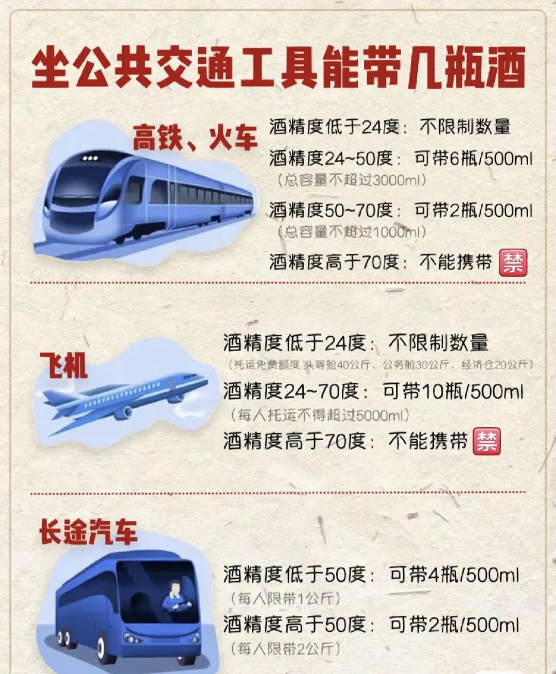 那么,如果我不开车,做火车、飞机、公共汽车可以带酒么?没问题的,满足下图条件,都可以带!