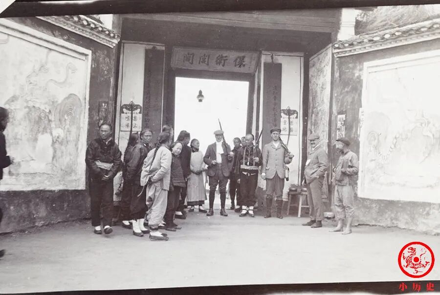 在团练营地大门口,有外国人和兵勇持枪合影。团练是正规军的补充力量,挑选壮丁加以军事训练,保卫当地的治安,门额上“保卫闾阎”四字说明了它的职能。门边挂着“营务重地”“禁止喧哗”警告牌。