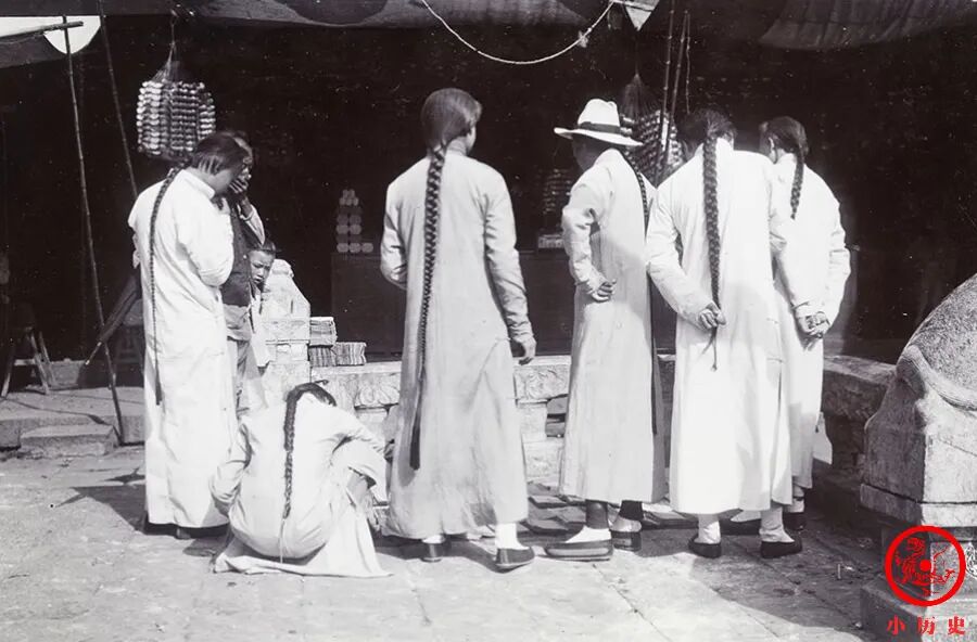 这张照片拍摄于上海城隍庙,多位青年正在一个书摊上挑选图书,他们背对镜头,展示出又粗又长、油光闪闪的大辫子。由于每一次洗头、编辫子需要花费很长时间,所以他们每隔十天半个月才梳洗一次,平时难免会发出酸臭的味道。