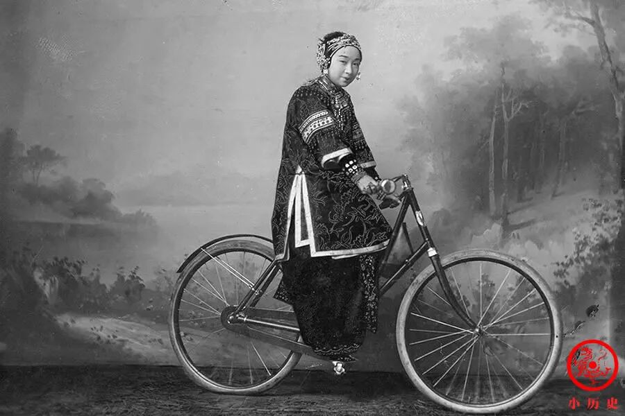 这张照片体现了时尚与古老传统的奇怪融合。自行车是清末很新鲜、很奢侈的物品,普通人没有机会碰一碰;而画面中女子身上的抹额、袄裙、小脚,都有着悠久的历史,代表着顽固守旧的一面。
