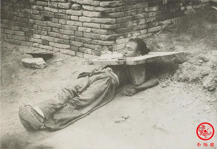 戴枷示众是一种很残酷的处罚方式,卡住脖子的枷板重达30斤以上,双手被铁链锁在枷板上,这种情况下囚徒不能正常吃喝拉撒睡,痛苦不已。照片中的囚徒用砖头撑起枷板,勉强躺下休息,那种煎熬展露无遗。