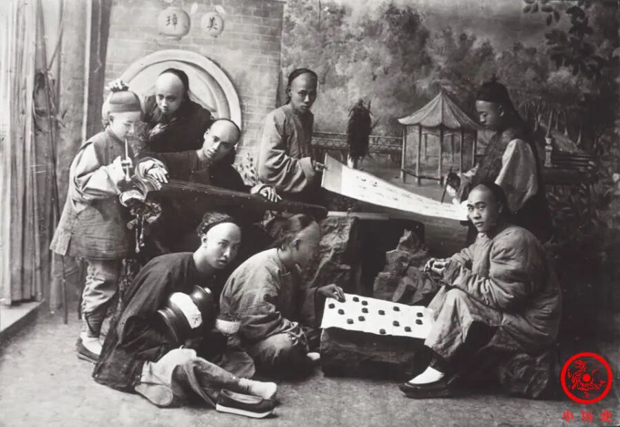有人在对弈、有人在弹琴、有人在写书法……种种高雅的爱好,都是有钱有闲的文人从事的活动。照片上写“美璋”二字,是拍摄这张照片的照相馆的名称,在清末民初时期广为人知。