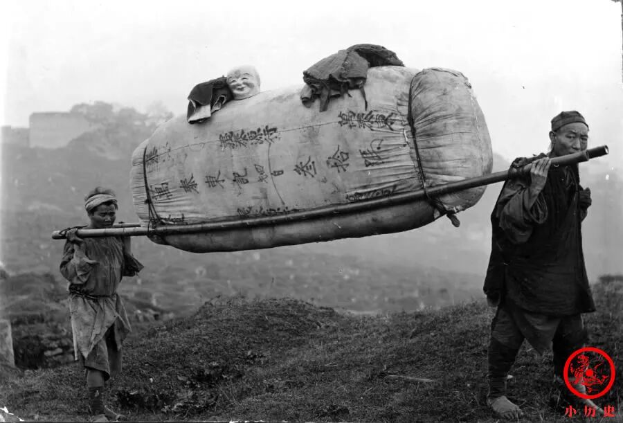 照片拍摄于四川。两位穿着草鞋的男子在山路上抬着巨大的棉花包裹吃力地前行。包裹上面写着“义泰源行”“万泰东记”,可能是有关商号的名称。他们带着一个面具,是为了保佑一路平安么?