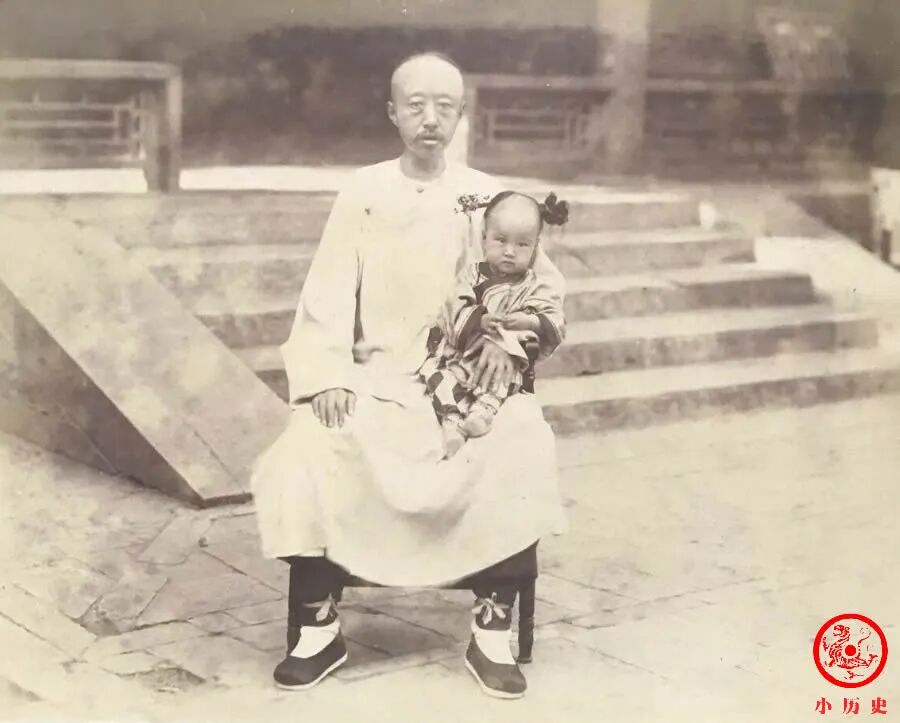 奕譞一生娶妻妾4人,嫡妻婉贞是慈禧太后的亲妹妹,作为“慈禧太后的妹夫”,比王爷的头衔还显要。他生育子女10人,其中二儿子载湉做了皇帝,五儿子载沣承袭王爵,生个儿子也做了皇帝。醇亲王家族连续两代出了两个皇帝,但是结局都不好。他怀里的小孩不知道是谁?威严的王爷做“奶爸”时也充满柔情。
