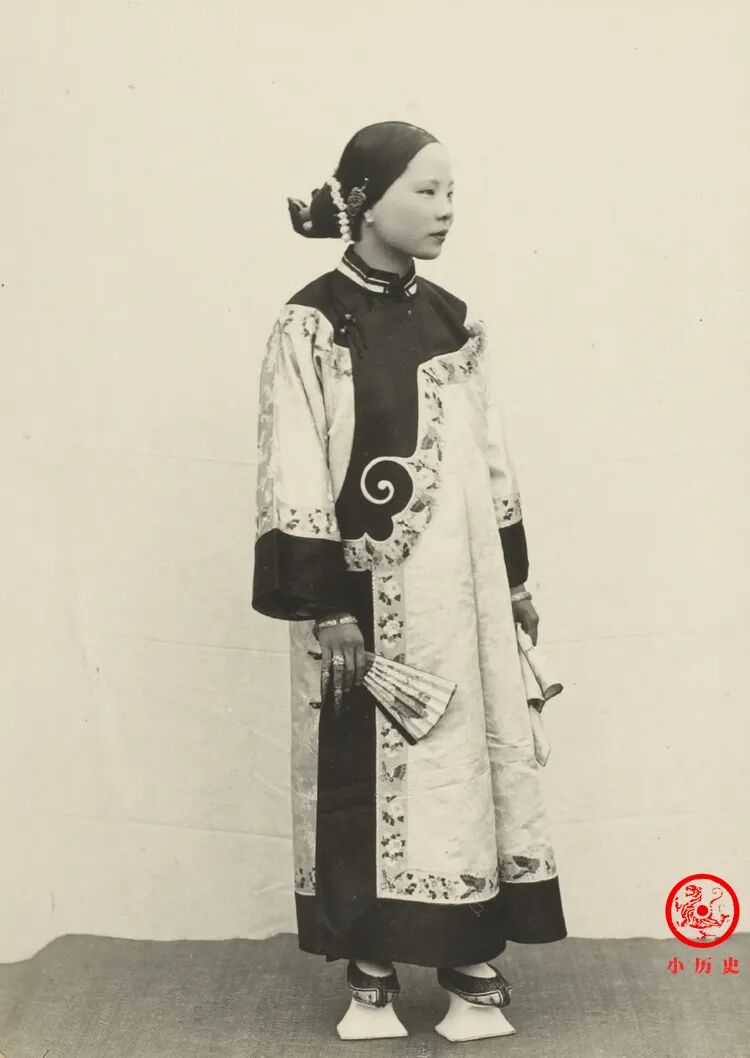 这位女子来自富贵之家,妆容精致,氅衣精美,高高的马蹄底鞋让她看上去身材高挑。现代女性穿高跟鞋,清朝旗人女性穿马蹄底鞋、汉人女性裹小脚,彼此的目的不同,在脚上下功夫则是一致的。