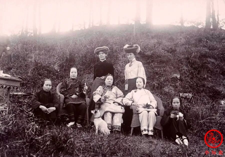 清朝末年,中外人员之间的交流越来越频繁,当然,这种交流仅限于上流社会。照片中中国女性所在的家族,很可能与洋人妇女家庭之间有着商业往来。