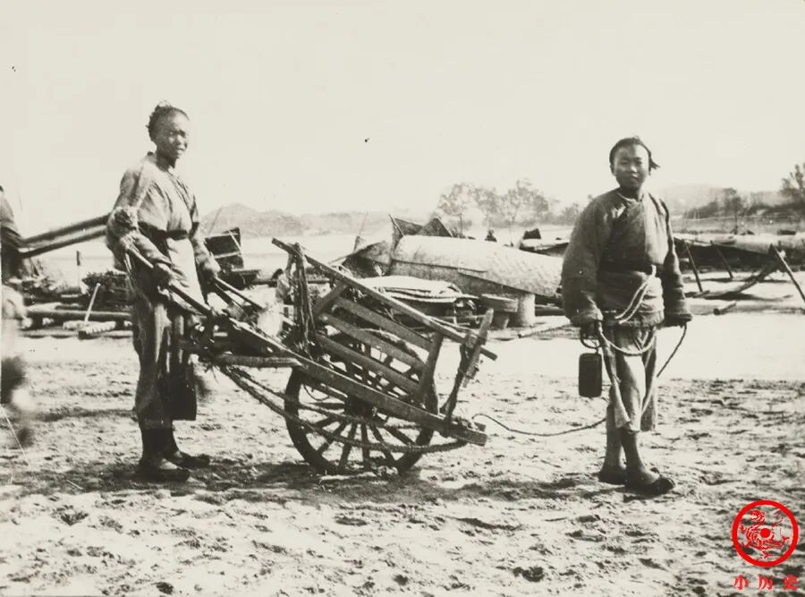 照片中的独轮车是清朝(民国时仍普遍使用)百姓常用的运输工具,很多人用这个简单的车辆做短途运输,借此谋生。