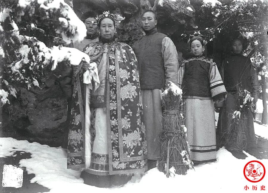 慈禧太后晚年大部分时间不在紫禁城,而在颐和园。因为颐和园有山有水,酷似江南风光,她就在颐和园处理政事、颐养天年。图中左一人物是大太监崔玉贵,右二女性是庆亲王奕劻的四女儿,常年在宫里陪伴太后。