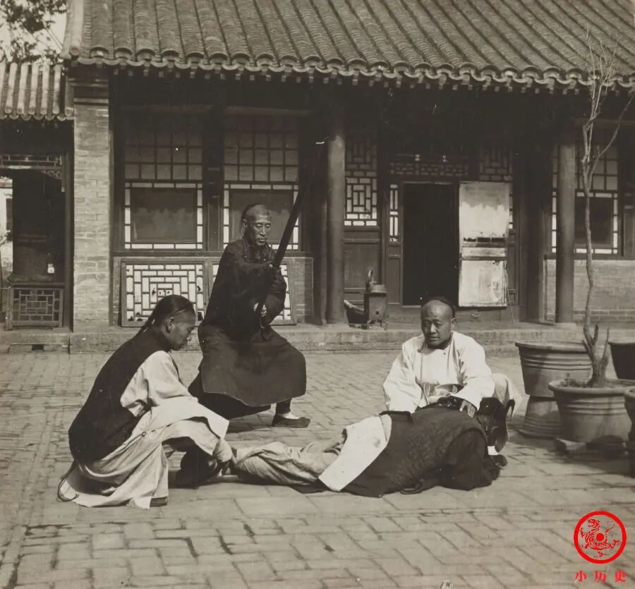 下面这张照片我以前发过,这是官府衙役执行杖刑的场景。最近,我对它背后的信息有了更多的了解。
