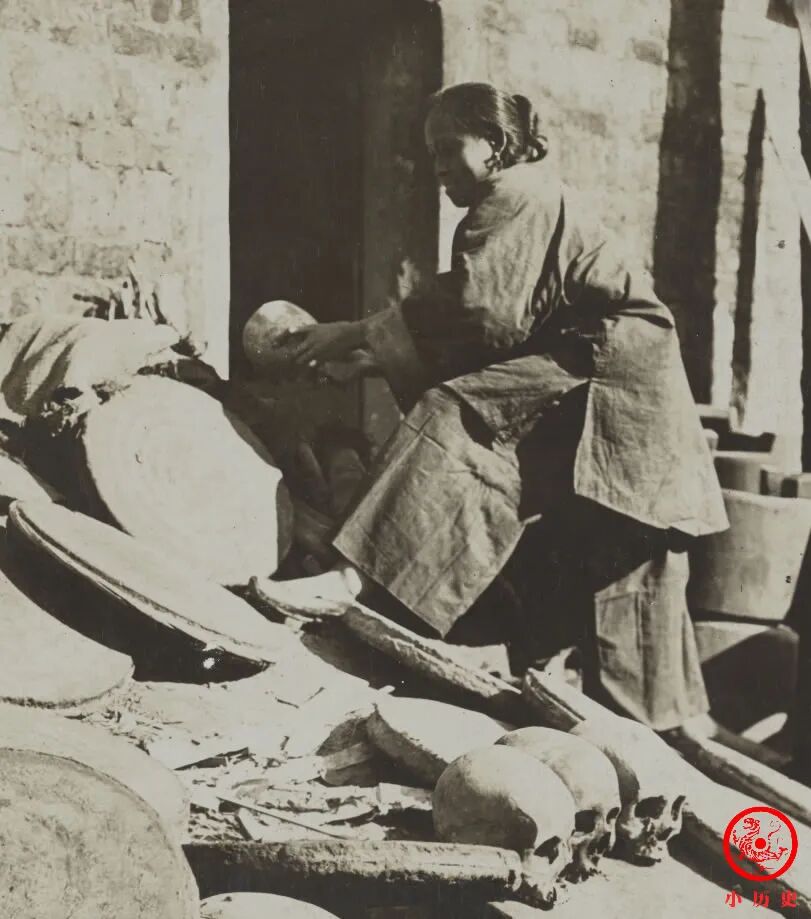这张照片的信息:1902年,一位刽子手的妻子晾晒头骨。