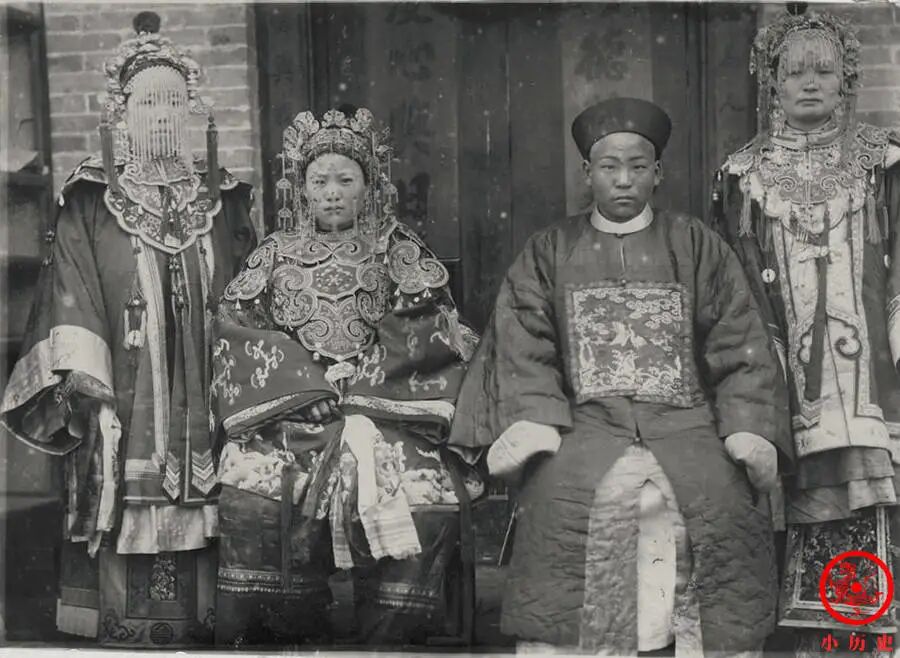 新娘凤冠霞帔,盛装出镜,如果是彩色照片,肯定非常耀眼。新郎穿补服,是一名官员。他们身后两位女子也衣着喜庆,或为伴娘。