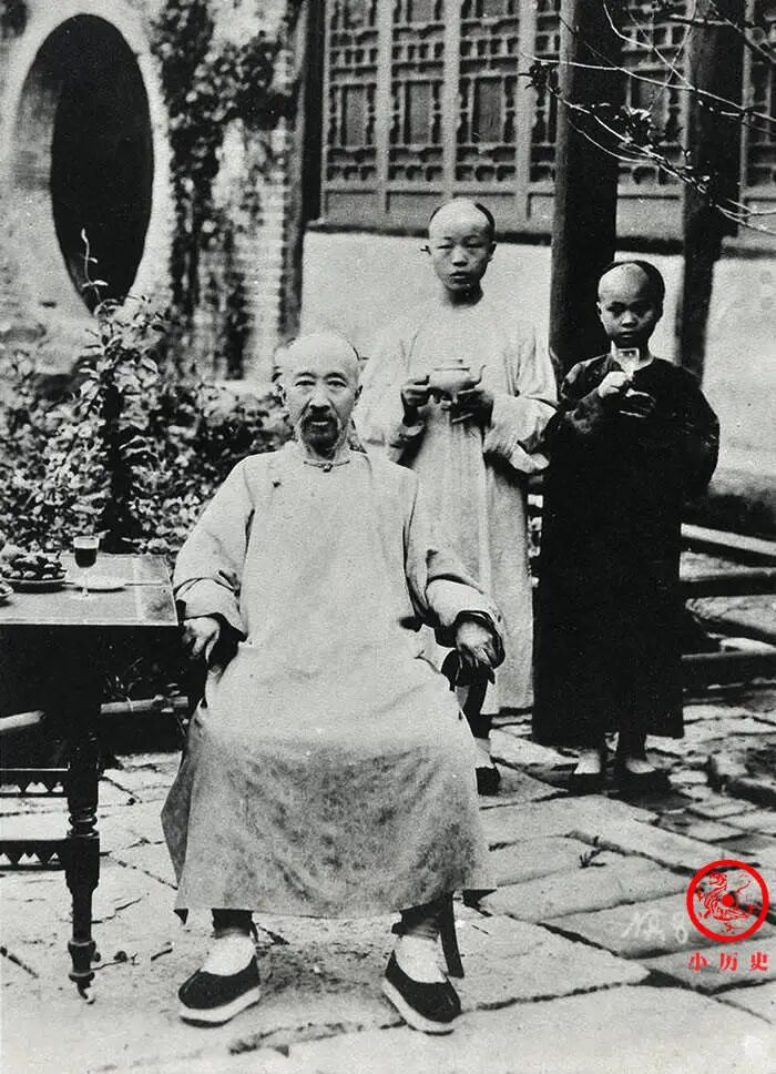 张之洞在湖广总督任上10余年,办了大量洋务事业。教育方面创办了自强学堂(今武汉大学前身)、湖北农务学堂、武昌蒙养院、湖北工艺学堂等。工业上创办汉阳铁厂、大冶铁矿、湖北枪炮厂等。八国联军入侵时,张之洞也是参与“东南互保”的关键人物之一。照片里的总督大人身着便装,有两个童子侍立,气氛轻松而又不失威严。