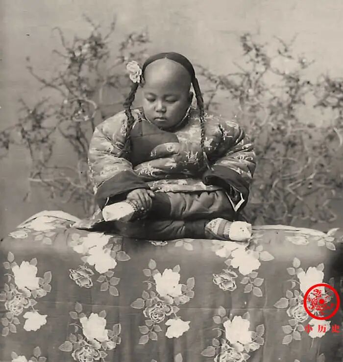 一个5岁左右的小女孩,已经遭受缠足的摧残,实在令人痛心。她的双脚被布带紧紧缠裹,骨骼逐渐畸形变小,直到成年骨骼定型后才将布带解开。清朝缠足的歪风最为严重,蔓延至社会各阶层的汉族女子,不论贫富贵贱,都纷纷缠足。