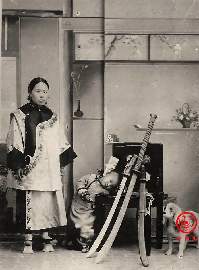 这张照片的特别之处在于摆放着3把大刀,体现了旗人的尚武精神,女人、孩子也不例外。